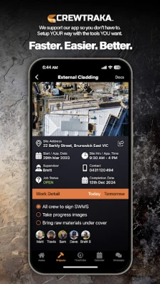 Objavte CrewTraka™, špičkové cloudové riešenie navrhnuté pre moderného remeselníka a podniky v sektore služieb, ktoré prichádza bez počiatočných poplatkov a s plnou podporou, bez viazanosti zmluvami a možnosťou kedykoľvek zrušiť. Tento systém, pôvodne vyvinutý v Austrálii, teraz mení pravidlá hry v efektívnom riadení posádok a projektov. Unikátne prepája váš tím prostredníctvom jedného centrálneho rozhrania, odkiaľ môžete plánovať ľubovoľne veľké tímy na rôznych projektoch pomocou nášho intuitívneho systému drag-and-drop. CrewTraka™ vám umožní detailne sledovať odpracované hodiny, nadčasy a dovolenky, zdieľať pracovné detaily, vytvárať prispôsobiteľné kontrolné zoznamy a formuláre, efektívne riadiť výdavky a spravovať kľúčovú bezpečnostnú dokumentáciu ako SWMS či JSA.