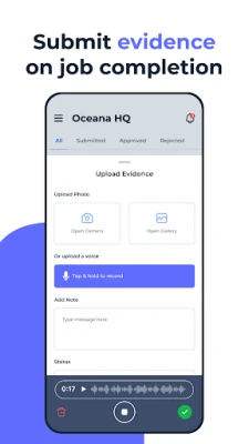S FieldServicely sa správa pracovných úloh stáva intuitívnou a presnou. Ľahko vytvárajte nové úlohy, prideľujte ich terénnym technikom a plánujte smeny pomocou jednoduchého pretiahnutia na kalendár. Systém vyžaduje predloženie dôkazov po dokončení práce, ktoré manažéri následne vizuálne aj zvukovo overia a schvália, čím zaručia kvalitu a dodržanie štandardov. Navyše, FieldServicely umožňuje sledovanie polohy vašich zamestnancov v reálnom čase a využíva geoploty na automatické zaznamenávanie ich dochádzky pri príchode a odchode z pracoviska, čím eliminuje administratívne zaťaženie a zvyšuje presnosť. Technici môžu pridávať poznámky k úlohám a manažéri na ne priamo odpovedať, čím sa posilňuje transparentná komunikácia.