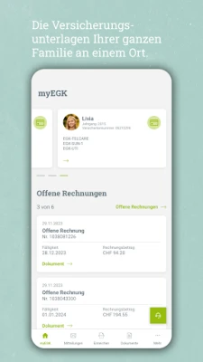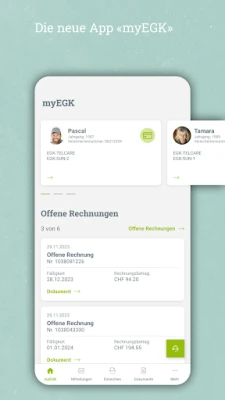 Aplikácia myEGK vám prináša aj praktickú digitálnu poistenú kartu Vicard, ktorú môžete použiť pre seba aj pre celú vašu rodinu u viac ako 5000 poskytovateľov zdravotnej starostlivosti vo Švajčiarsku. Navyše, všetky poistné krytia rodinných príslušníkov môžete centrálne spravovať z jedného miesta. Potrebujete sa spojiť s EGK-Gesundheitskasse? Píšte správy priamo cez aplikáciu a získajte rýchle odpovede. myEGK je dostupná pre poistencov EGK-Gesundheitskasse s platným základným a/alebo doplnkovým poistením, prinášajúc efektivitu a pokoj do vášho každodenného života.