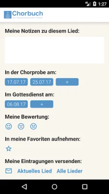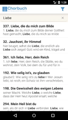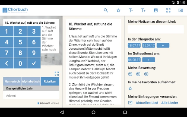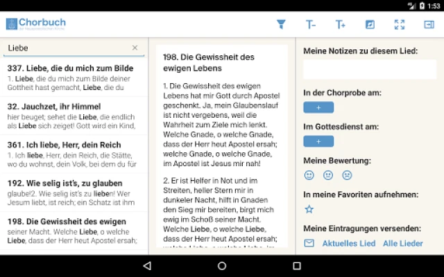 Chcete pripraviť špecifické piesne na nadchádzajúcu bohoslužbu? Potrebujete poslať zoznam nacvičených piesní ostatným členom chóru alebo služobníkom? Alebo si jednoducho chcete zaznamenať pieseň, ktorá vás oslovila? Prémiový balík Chorbuch-App odomyká pokročilé nástroje pre dirigentov, organistov a všetkých hudobných nadšencov. Umožňuje filtrovať a triediť výsledky vyhľadávania podľa rôznych kritérií, zaznamenávať osobné poznámky ku každej piesni, pridávať termíny skúšok alebo bohoslužieb, kde sa pieseň spievala, hodnotiť piesne trojstupňovou škálou a označovať ich ako obľúbené. Všetky tieto cenné informácie a prémiové záznamy môžete pohodlne odoslať e-mailom, čím sa stane plánovanie a zdieľanie hudobného obsahu pre skupinu nesmierne efektívne.