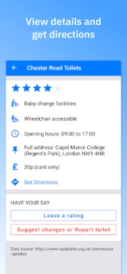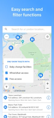 Táto praktická platforma zhromažďuje detailné informácie priamo od mestských úradov a komunitných skupín. Získate tak spoľahlivé údaje o otváracích hodinách, bezbariérovom prístupe a dostupnosti prebaľovacích pultov, čo vám uľahčí plánovanie. Toilets4London vás tiež pozýva k aktívnej účasti: môžete nahlásiť zle udržiavané alebo nepresné údaje o toaletách, ohodnotiť ich hygienu (vaše hodnotenia sa posielajú prevádzkovateľom) a dokonca navrhnúť nové miesta na pridanie do mapy, čím prispievate k zlepšeniu služby pre všetkých.
